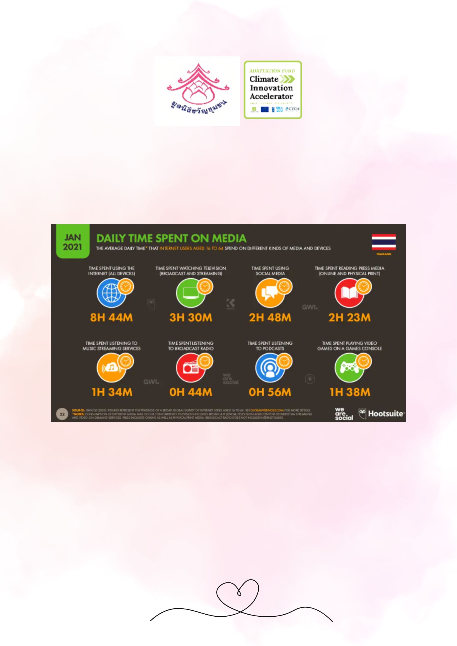 Thai people spend an average of 5.07 hours per day on the social media, which is the third highest in the world and if counting the use of the entire internet system, Thai people's use of the internet has increased to an average of 10 hours per day, or 41% of their time spent in one day.